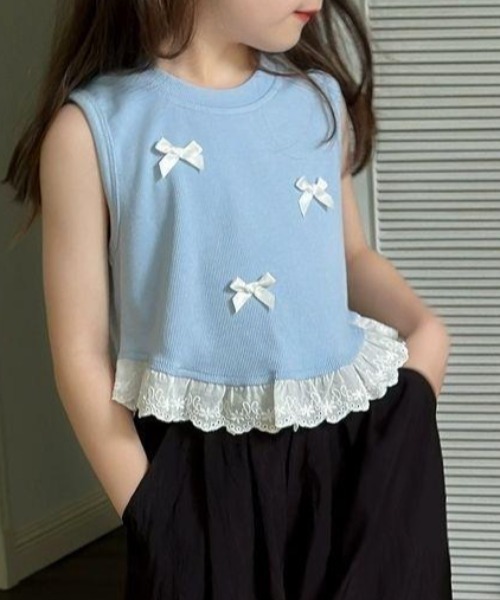 フロントに3つのリボン、裾にレースのデザインをしたタンクトップ