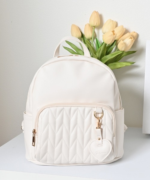 ポケットのステッチとハートモチーフのチャームがアクセント。