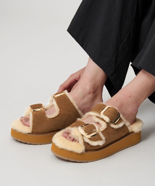ムートンを使用したふわふわの履き心地が魅力の、ビックバックルサンダル。