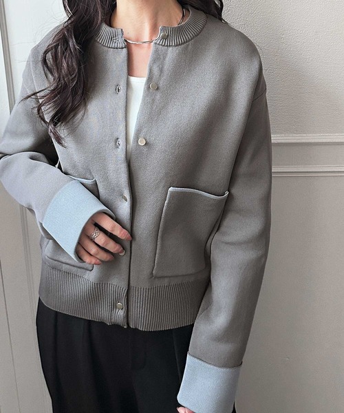 配色使いがスタイリングのポイントになるニットカーディガン。
