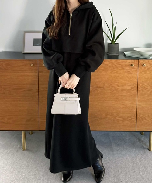 ショート丈パーカーとIラインワンピースがドッキングしたスウェットワンピース。