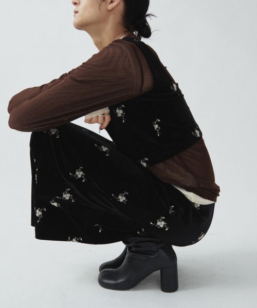 柔らかなベロア素材にフラワー刺繍を施したナロースカート。
