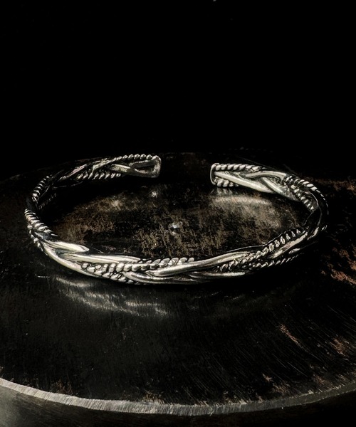 緻密に編み込まれたようなツイストデザインが印象的な、クラフト感漂うシルバーバングル。