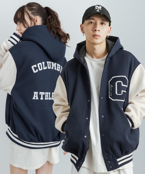参考商品名:オーバーサイズ ウールライク ワッペン刺繍スタジャン フード付きブルゾン