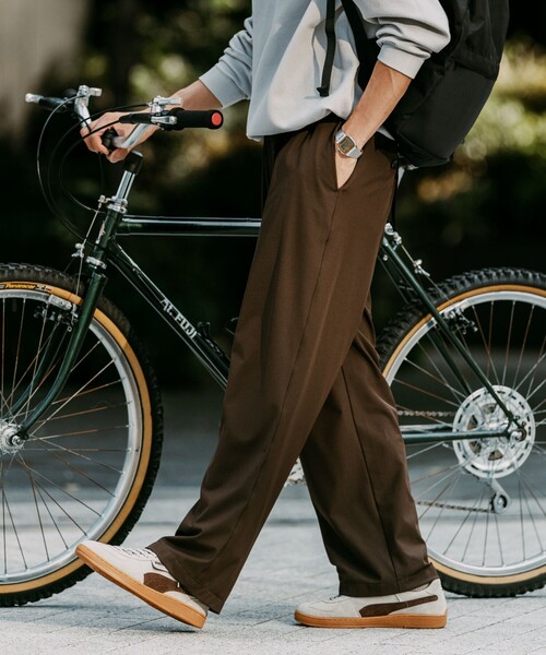 ゆったりとしたシルエットのワイドパンツ。