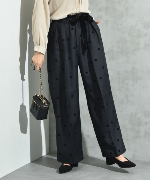 センターライン入りの綺麗目ワイドパンツ。パッと目を惹くドット柄でいつものスタイルのアクセントに◎シーズンムードを盛り上げてくれるベロアウエストリボン付きで登場です。