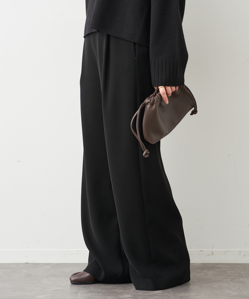 リラクシーで綺麗見えが叶う素材と楽に履けるウエストゴムのイージーな仕様のシルエットが美しい1タック型のワイドパンツ。