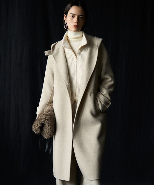 ■デザインさっと気負いなく羽織れる、フード型ロングコート。フロントをあけて着ると、ゆとりのあるシルエットがリラックスした大人の女性らしいムードに。フード部分はタブで留められ、防寒対策もしっかりとしています。ゆったりした身幅と袖なので、中に着るインナーの厚みを気にせず着用いただけます。リバー仕立てなので軽量なのに暖かく着られる、万能NEWアウターです。カラーは柔らかく軽やかなオートミール(#033)、肌馴染みの良いモカ(#030)、こなれた印象のミディアムグレー(#004)、王道主力カラーのブラック(#005)の4色展開です。