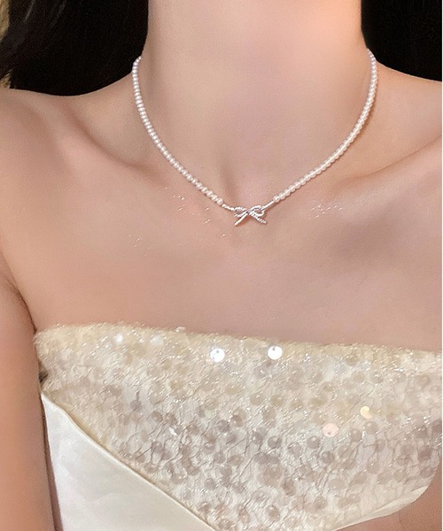 繊細なエコパールに、中央の華奢なリボンモチーフが映える可憐なデザイン。フェミニンさと上品さを兼ね備えたアクセサリーです。