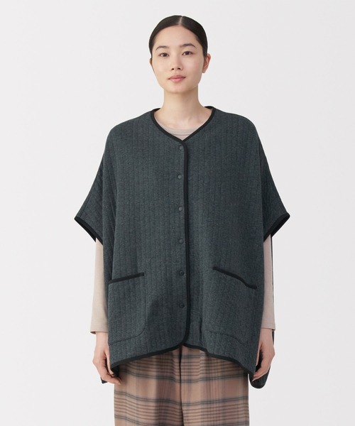 スリーブレスで動きやすく、朝の支度や家事の合間などにさっと羽織れるリラックス感のあるポンチョです。ゆとりのあるシルエットで、パジャマやルームウェアの上にも重ねやすくなっています。秋口の軽い羽織としてはもちろん、寒い冬には室内の防寒着としても活躍します。