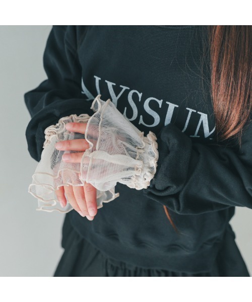 チュール素材の付けフリルです。ゴム入りなので手首に付けたりシュシュのようにヘアアクセサリーとしても使用して頂けます。