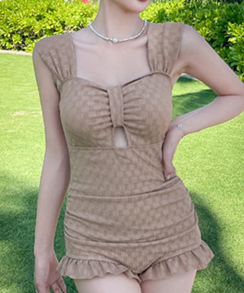 大人っぽく着こなせる、フリル付きショートパンツ一体型のワンピース水着。