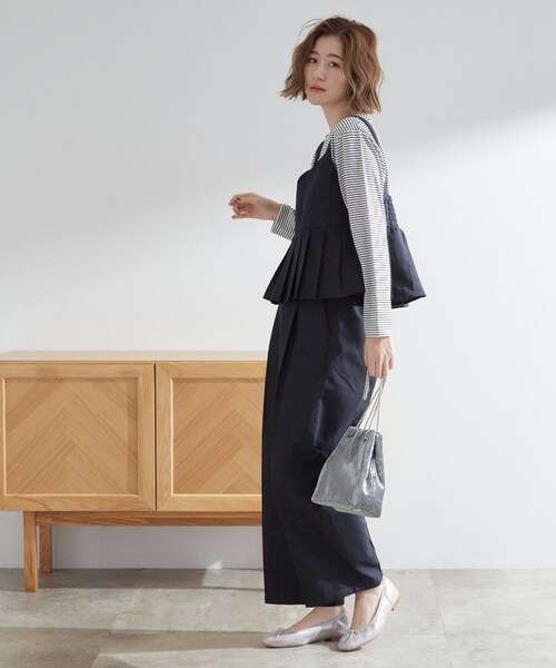 ビスチェ単体だけでもトレンド感ある着こなしが楽しめますが、セットアップで着用することでサロペット風の着こなしが楽しめるのがポイントです。