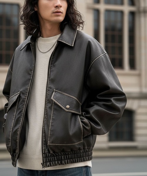 全体に施されたリアルなダメージ加工が魅力のフェイクレザーライダースブルゾン。