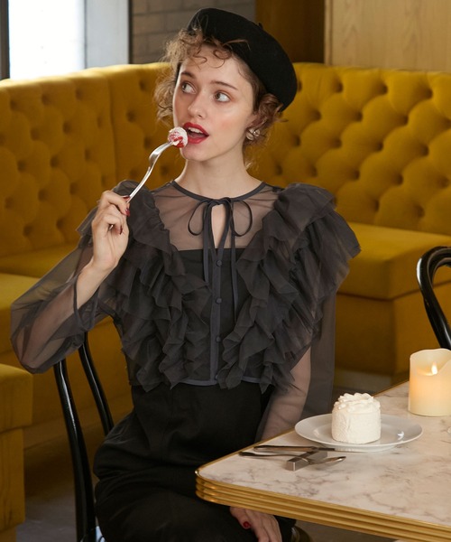 たっぷりフリルのチュールブラウスで華やかにドレスアップ