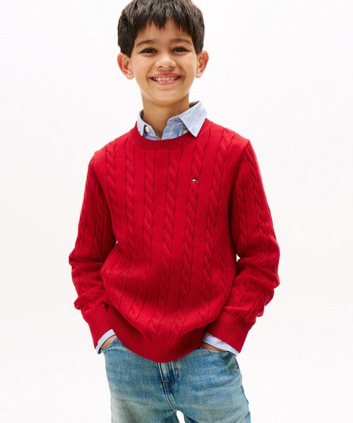立体感のあるケーブル編みが印象的なクルーネックセーターです。首元や袖口、裾をリブ編みにして、程よくフィットするシルエットに仕上げました。胸元にはフラッグロゴもあしらわれています。着回し力の高い、シンプルなデザインの一着です。