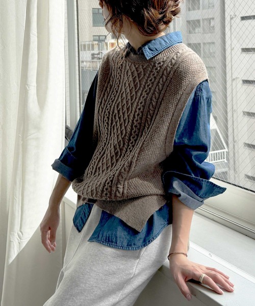 立体感のあるケーブル編みが、コーディネートにあたたかみと奥行きをプラスしてくれるニットベスト。