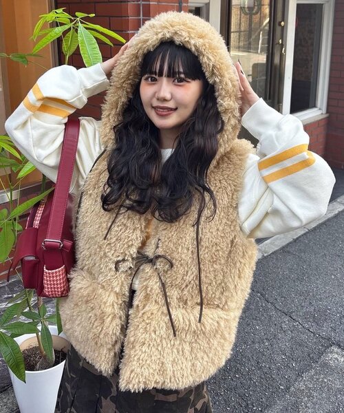 フードまでふわふわファーで仕立てた、軽やかな着心地のファーベスト。