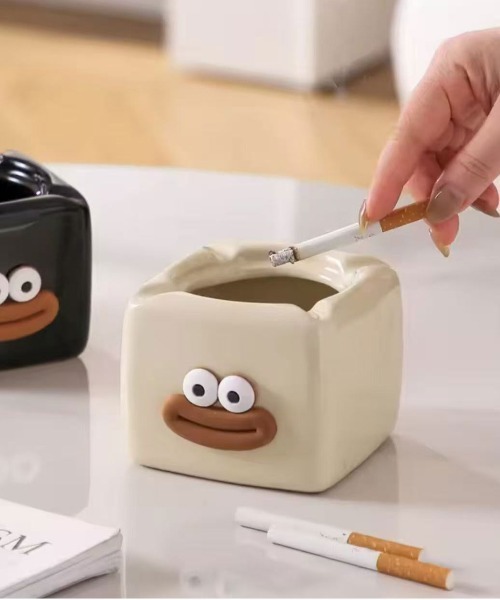 陶器ならではのしっかりとした重みと、洗練されたツヤ感が特徴のセラミック灰皿です。ポイントは、着脱可能な「顔」パーツ。