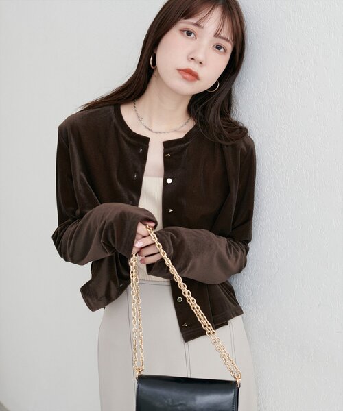 上品な光沢を放つベロア素材が、大人の女性らしさを引き立てるカーディガン。