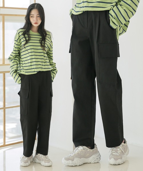 キーワード:カーゴパンツ レディース ウエストゴム ストレート ハイウエスト フルレングス 無地