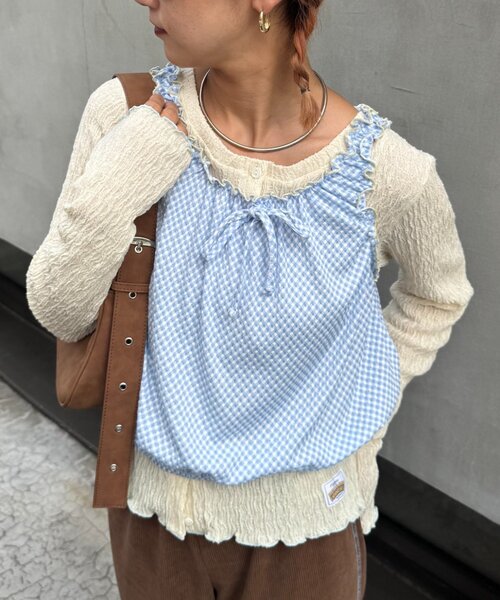 やや透け感のある白のカットソーと、ギンガムチェックのバルーントップスがセットでこれ1つでコーデが完成◎
