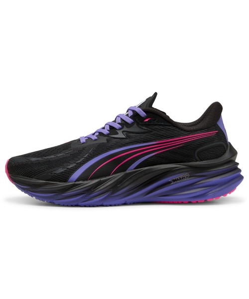 「ヴェロシティ 4」は、すべてのランナーのために設計された次世代ランニングシューズ。DIGITOKYOバージョンは、東京の夜の光と質感からインスピレーションを得た、大胆でエネルギッシュなデザイン。走るたびに、都市の鼓動を感じられるデザインです。記録更新を目指す日も、気ままなジョグの日も、あなたの足元に確かなサポートと軽やかな推進力を提供します。これまでで最も軽量なベロシティは、フルレングスのNITROFOAMミッドソールを搭載し、驚異のエネルギーリターン85%を実現。反発力とクッション性を両立し、長距離でも疲れにくい快適な走りをサポートします。アッパーにはエンジニアードメッシュを採用し、通気性を大幅に向上。さらに、必要な箇所にPWRTAPEを配置することで、軽量ながらもしっかりとしたサポート性を確保。足首周りにはロールカラー構造を採用し、フィット感と快適性を高めています。アウトソールにはPUMAGRIPを使用し、濡れた路面や不整地でも優れたグリップ力を発揮。耐久性にも優れており、最大800kmの走行に対応します。また、アッパーには30%以上のリサイクル素材を使用し、環境にも配慮。サステナブルな選択をしたいランナーにもぴったりの一足です。