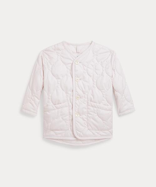 リサイクルポリエステルを使用したキルティングジャケット。水をはじきやすい生地と熱を逃がしにくいダウン代替素材の中綿を使用。