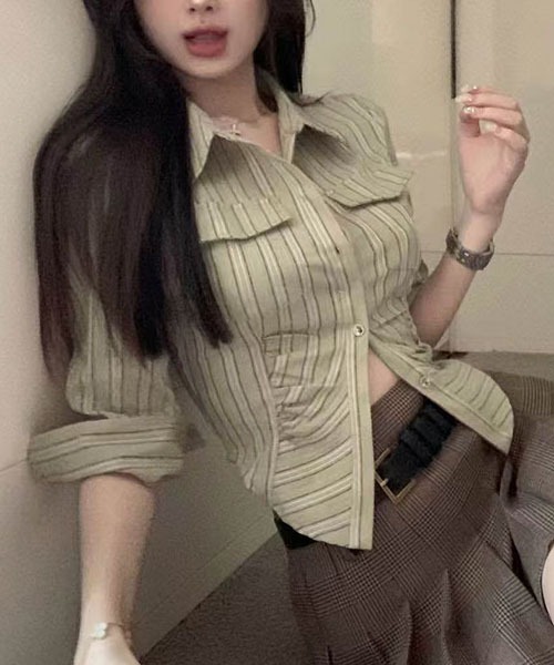 ビンテージ感のあるムードを漂わせるストライプパターンをフェミニンなシルエットに仕上げた絶妙なバランスが魅力のシャツ。ウエスト周りに入れたタックがくびれたシルエットを作り、クロップド丈のシルエットがセンシュアルな着こなしを後押しします。フラップデザインがワーククローズのようなラフなテイストをプラスし、ワークパンツからフェミニンなミニスカートまで幅広いボトムスとフィット。