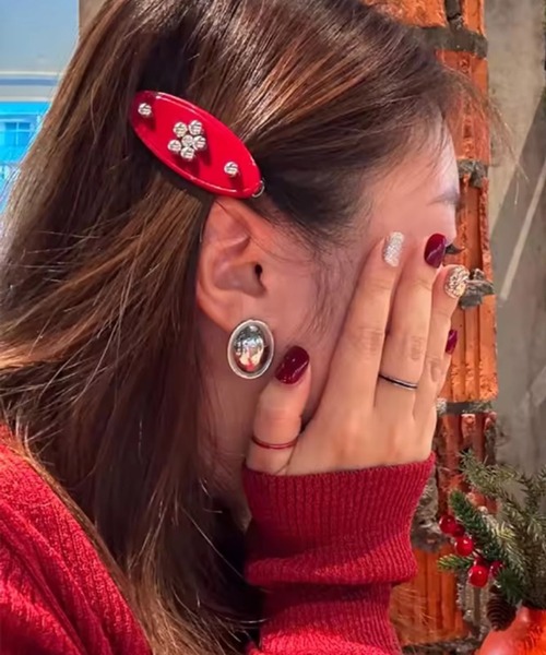 メタルスタッズがヘアスタイルのアクセントになるオーバル型ヘアクリップ。