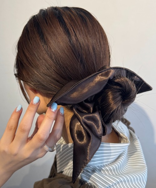 光沢のあるサテン素材がポイントのサテンシュシュが登場!上品なスクエア柄デザイン