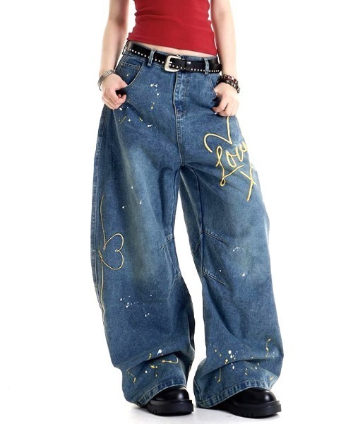 新作 春 夏 秋 冬 春服 夏服 秋服 冬服 オールシーズン ワイドパンツ バギーパンツ カーブパンツ デニム 刺繍 ハート ペイント加工 ゆったり 体型カバー カジュアル ストリート スポーティー 韓国 韓国ファッション トレンド 主婦 学生 ギャル Y2K 海外ガール シティガール ダンス メンズライク 着回し お洒落 10代 20代 30代 40代 50代