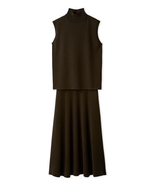 ふわっとしていて軽く、少し起毛感のある糸で編み立てた、ハイネックのノースリーブトップスと、ナローシルエットのスカート。うれしい2枚セットです。