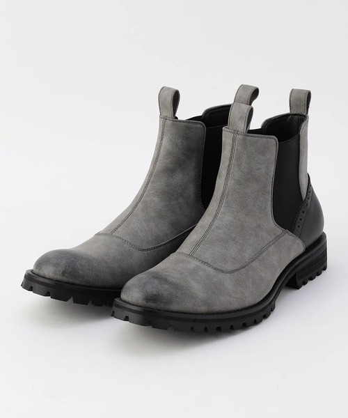 少し厚みのあるタンクソールのサイドゴアブーツ。トゥスプリングの効いたシャープなシルエットで少し細長いの綺麗なラスト(木型)を採用しています。履き口の形状や切り替えデザインなど曲線を意識した綺麗なラインが特徴的で、メダリオンを入れた牛革のヒールカウンターがアクセントです。インソールはフィット感の高いソフトなタイプを採用、タンクソールはコバを張り出し、中間に5mm程のEVAを挟み、厚みのあるボリューム感を出しながら軽量感・クッション性を高めています。ブランドストーンなど機能性を重視したブランドに多い、履き口の前後にストラップを付けていますので履きやすいです。トゥ部分には手作業による仕上げ加工を強めに入れて重厚感のある雰囲気を出しました。綺麗めからカジュアルな組み合わせの相性も良いので冬のコーディネートの幅を広げてくれます。(※EVAとは、エチレンビニールアセテートの頭文字をとったソール素材の頭文字です。 EVA は自然に伸縮性のあるエラストマー ポリマー素材で、並外れた柔らかさと柔軟性を提供します。)