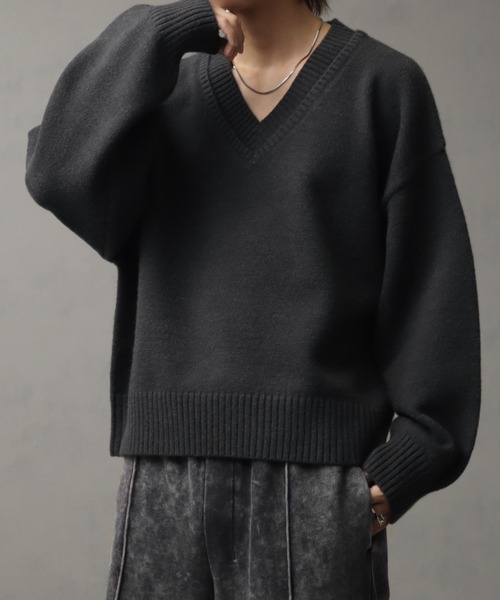 2重構造の襟部分で一味違う雰囲気を表現した、人気ニットセーターのVネック仕様。