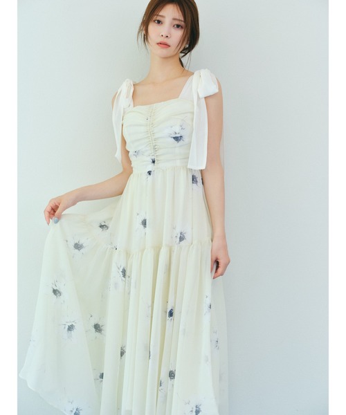 2015年の花柄プリントを復刻したシリーズ。軽やかなシフォン素材をたっぷりと使用し、歩くたびにふわりと揺れるシルエットが魅力です。高めの切り替えと肩のリボンデザインで、自然と目線が上がりスタイルアップ効果も◎肩リボンには無地の楊柳生地を使用し、異素材ミックスが上品なアクセントに。背中部分はシャーリング仕様で、フィット感がありながらも快適な着心地。左身頃に着脱のファスナー付き。1枚でさらりと着るだけで、華やかさと大人の可愛さが両立する主役級ワンピースです。