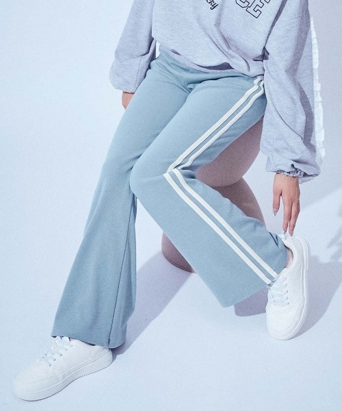 人気のラインパンツをストレッチ素材でご用意。脚がすらっと見えるフレアシルエットもポイント〇