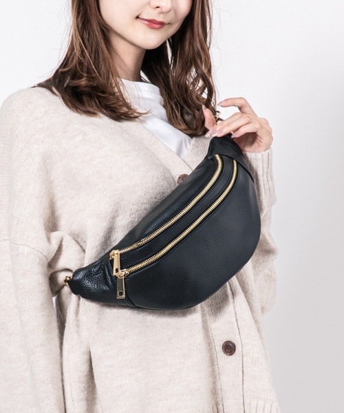 ゴールドファスナーと高級感のあるレザーが品格を高めるボディバッグ