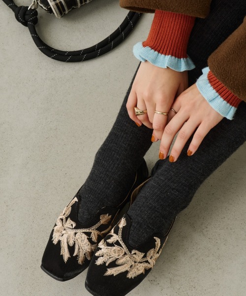 繊細な刺繍デザインが目を惹く、フェミニンムード漂うフラットシューズ。