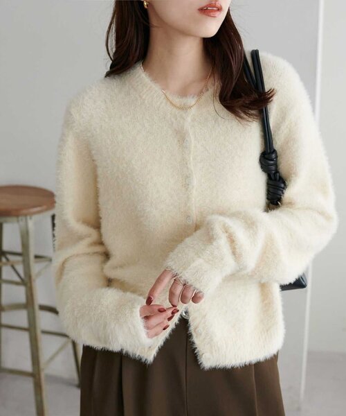 柔らかく軽やかな着心地のフェザーヤーンクルーカーディガン・滑らかでふわふわとした優しい触り心地が特徴。