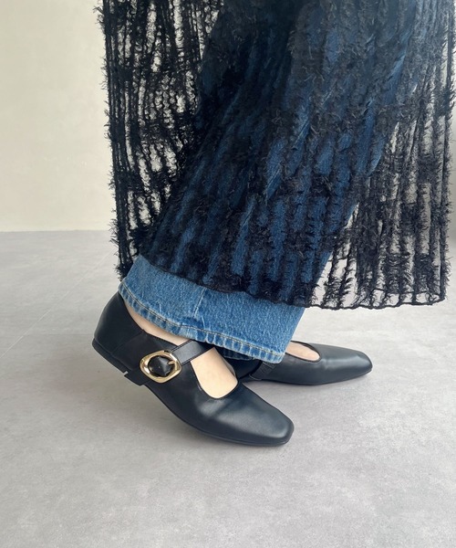 ほんのりスクエアカットしたラインでこなれ感を出しつつ、ゴールドの変形バックルでひとクセ加えたストラップパンプス。