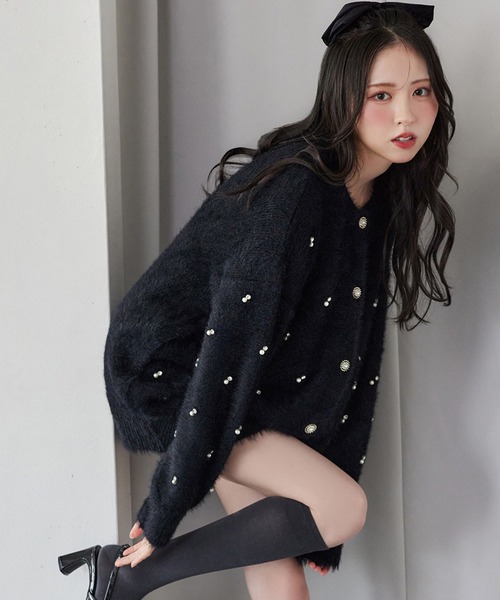 ふんわりとしたフェザー素材に、きらっと輝くビジューをあしらった主役級カーディガン。