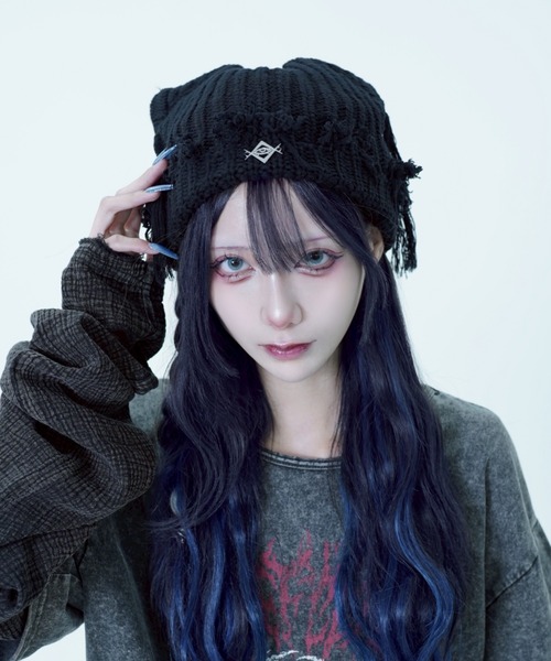 フリンジやダメージ加工が特徴的な猫耳ニット帽。