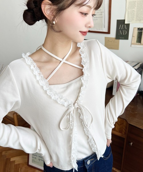 カーディガンのレースはフロント部分だけでなく襟元にも施されていて、とても可愛いです。キャミソールはクロスしてもリボン結びしても可愛♪。