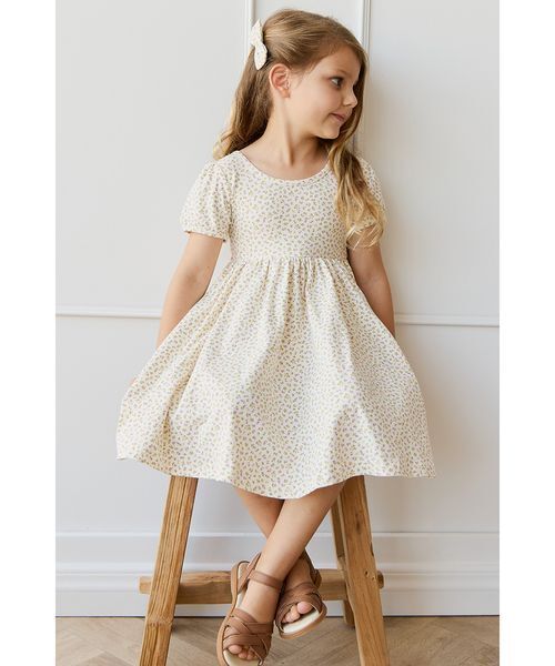 胸下にギャザーがたっぷり入っており、Aラインにふんわり広がるシルエットの半袖ワンピース。