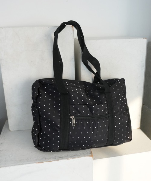 軽量で持ち運びやすいナイロン素材を使用した、ドット柄のボストンバッグ。