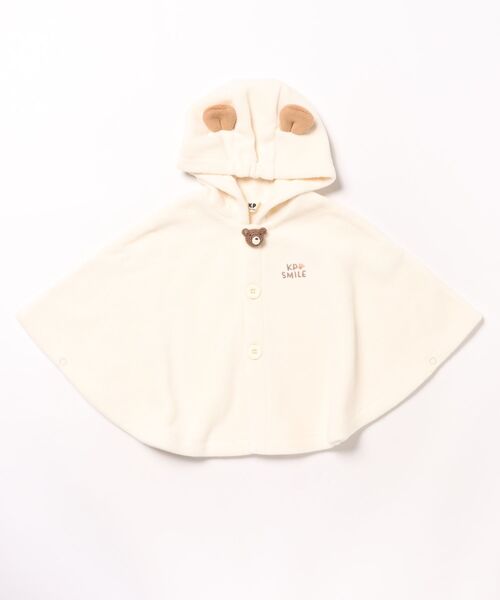 くまの耳のフードと首元のくまの編みぐるみが、お子さまの可愛らしさを引き立てるマントです。フリースの軽くてやわらかいぬくもりで、寒い日のお出掛けも安心。自家用はもちろん、ギフトにもおすすめの1枚です。