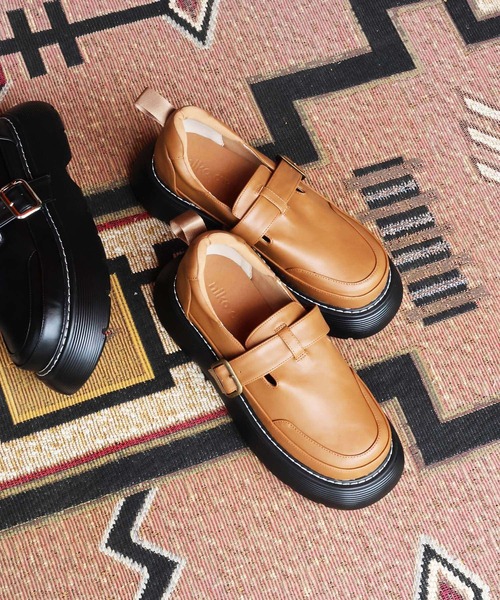 丸みのあるボリュームソールが特徴のTストラップシューズ。
