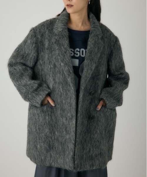 今年らしい毛足の長いシャギー素材のビッグショルダーのアウターです。