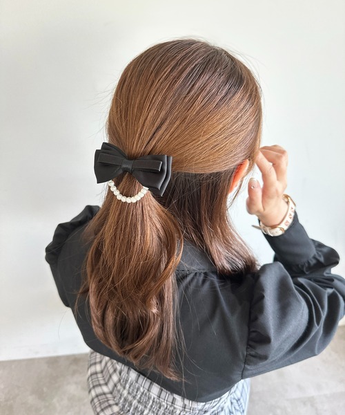 立体感のあるリボンモチーフにフェイクパールをあしらった、華奢見えヘアクリップピン。
